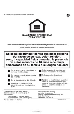 ComplyRight™ Federal fair HUD equal housing opportunity poster in Spanish language is updated with all the current activities and is ideal for workplace federal postings. Poster contains legal definitions of discrimination in real estate.