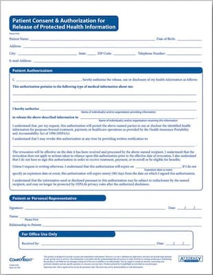 - Attorney approved form acknowledging patient's consent to release his or her protected health information to an authorized third party