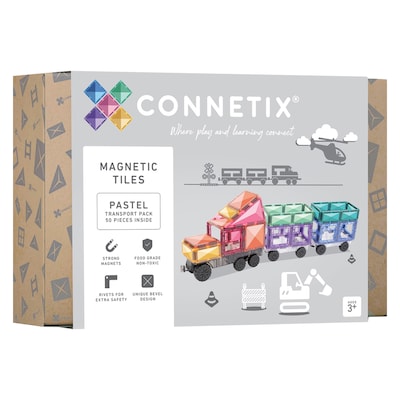 Designed with vehicle enthusiasts in mind, this pack takes magnetic tile play up a gear! Featuring our iconic REVERSIBLE transport base in light grey, two clear motion bases with REAL rubber wheels, plus a range of magnetic tile shapes, the CONNETIX 50 Piece Pastel Transport Pack allows you to imagine and create endless vehicle designs. It also expands the range of colors children can explore with eight pastel colors in hues of rose, berry, peach, mint, emerald, lemon, violet and sapphire. Discover STEAM learning as you navigate magnetism, shapes and color to recreate your very own trucks and trains, aircrafts and ambulances, fire engines and forklifts. This pack can help children learn about engineering principles such as stability, balance, and symmetry all while engaging in imaginative play. Featuring our signature bevel design for increased durability and clearer refractions, this pack is designed to grow with children as play and learning develops. Perfect for both independent play and collaborative play with siblings, friends and the whole family! Complement your CONNETIX 50 Piece Pastel Transport Pack with any of the packs from the CONNETIX range to take your vehicle creations to the next level. All tiles are made using non-toxic ABS plastic that is BPA and Phthalate free, ultrasonically sealed and "riveted for extra safety. Recommended for and enjoyed by builders ages 3+ years.