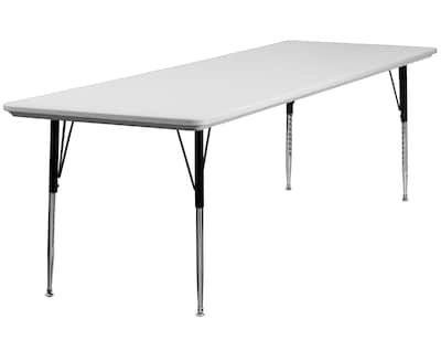 Gray granite 96" x 30" rectangular shape blow-molded plastic top adjustable height activity table has commercial duty construction, with black full steel frame.