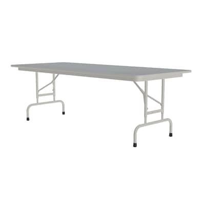 Correll Height Adjustable Folding Tables: These 30"x60" rectangular Gray Granite tables, made in the USA, feature a durable Thermal Fused Laminate (TFL) surface that resists scratches and stains, offering a sturdy writing platform. With height adjustment from 22" to 32" in 1" increments and a 3/4" moisture-sealed top, they provide versatile use in public and commercial spaces, including schools and places of worship. The tables boast a heavy-duty one-piece steel frame, automatic lock-open folding legs for safety, and Mar Proof foot caps for floor protection. With Gray steel frame and T-Molding, they are designed for longevity. Correll, in business since 1969, is a reliable choice, committed to outstanding customer service and product innovation, with over 90% of their products still MADE IN THE USA.