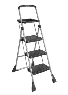 Lightweight yet durable steel work platform has three large heavy-duty polypropylene resin steps with slip-resistant treads and a large 14 3/4w x 12d top platform step. Handy molded utility tray holds tools, paint cans and wallpaper rolls. Extended hand-grip handle with tool holder. With non-marring, skid-resistant feet to provide stability and protect floor surfaces and easy one-hand fold and lock release. Select ladder of proper duty rating to support combined weight of user and materials. Material(s): Steel; Color(s): Black; Number of Steps: 3; Duty Rating: 225 lb.