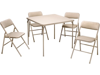 This Cosco five-piece folding table and chair set will make you ready for guests with an instant seating arrangement for four. The set will enhance any atmosphere, ranging from family gatherings, parties, or small space living if you're looking for a set to promote that lifestyle. Comfortable for entertainment and compact for storage, this set features durable steel frames and a powder-coated finish. This tan-colored set comes with a sturdy 34" square table with low-maintenance and easy-to-clean tabletop no matter the mess. The cross braces and tube-in-tube reinforced frame of the table guarantee a long-term investment you won't be disappointed in as you use it as desired. The four chairs, built for maximum comfort and durability, are upholstered in an attractive fabric with padding on the seat and back so you can relax in style as you converse with family and friends. The table and chairs are made of a sturdy steel frame and rubber tips to protect your floors without fear of slipping while in use and fold neatly for noninvasive storage techniques when needed.
