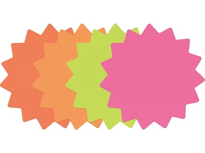 - Burst-shaped signs in four fluorescent colors - pink, light orange, dark orange, and green made of sturdy cardstock