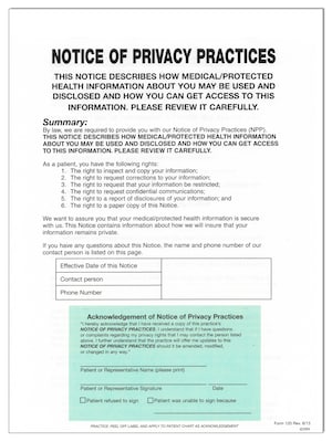 Form is over seven pages, completely comprehensive and includes all of the key elements required by HIPAA and more! The form also contains a removable label which provides practices with a written acknowledgement that the patient received the Privacy Notice (as required to be HIPAA compliant). No need for practice to make copies and file additional paperwork, simply place the label onto the patient folder. Form is also available in Spanish.