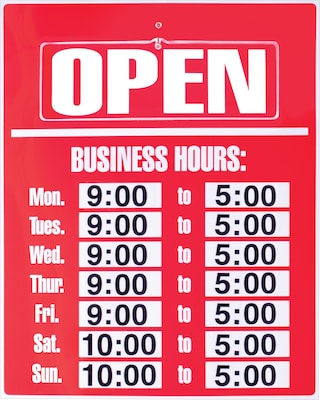 Cosco Sign kit in red color features pre-printed "Business hours" message and is made of weather-resistant plastic for added durability. Sign holder measuring 19" x 15" has repositionable vinyl numbers that helps to display operation hours clearly.