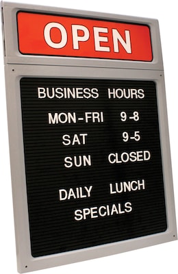 Cosco Open/close sign and character set measuring 20" x 15" can be detached and used separately. Character set includes optional business hours insert for convenience.
