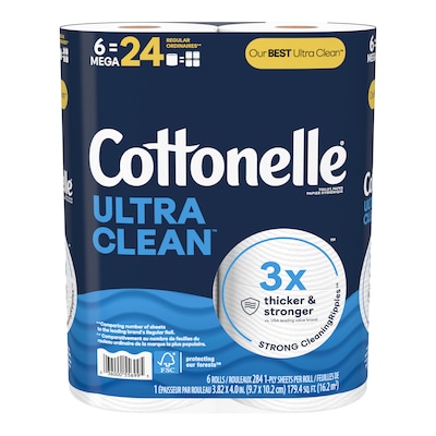 - 6 Mega Rolls of Cottonelle Ultra Clean Toilet Paper (6 Mega Rolls = 24 regular rolls*), 312 sheets per roll—packaging may vary from what is shown.