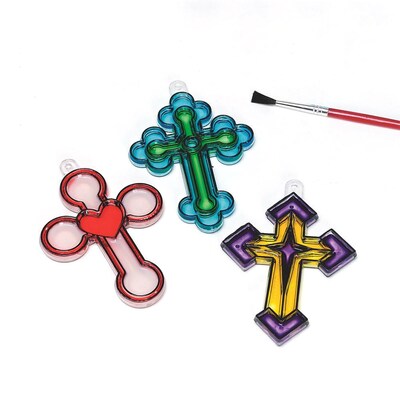 Craft EXpress Cross sun catcher craft kit includes 4 each of 3 assorted styles and has dimension of 3 1/4" X 2 1/2", sold as 12 per pack. Craft EXpress Cross sun catcher craft kit includes sun catchers, paint and brushes to make crosses. Craft kit is best suited for kids above 7 years of age, sold as 12 per pack.