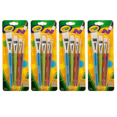 The brushes feature brushed silver ferrules and measure from 1 inch wide to 1/4 inch wide. With four brushes in different sizes, kids can paint an array of lines and strokes. The 4-3/4-inch wooden handles are a good fit for kid-size hands. Each handle has its own vibrant color. Featuring soft, white Taklon bristles to show paint's true color, the brushes are ideal for use with water-based paint such as Crayola Washable Paint, Tempera Paint, and Acrylic Paint. Recommended for ages 3 and up. Each pack includes 4 flat paintbrushes. Sold as 4 packs for a total of 16 brushes.