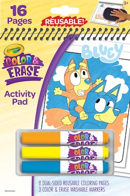 - CRAYOLA BLUEY ACTIVITY PAD: Features 8 dual-sided 5” x 7” reusable coloring activity pages and 3 washable markers.