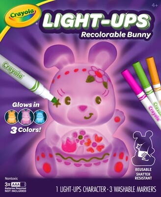 - WHAT'S INCLUDED: Hop into creativity with 1 Recolorable Light-Ups Bunny, 3 Ultra-Clean Washable Markers, and 1 Instruction Sheet (3 AAA batteries required - not included).