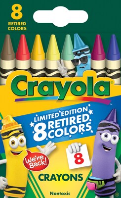 This 8 Count Box of Limited Edition Retired Crayola Crayons is full of colorful possibilities. Crayola Crayons are the classic kids' art tool. They are the colors generations have grown up with. Designed for true color vibrancy, smoothness, and durability, these non-toxic crayons are a staple for learning to spell, color, and draw. Their soft texture glides effortlessly on paper, while the double-wrapping ensures breakage resistance. This box of Retired Crayola Crayons opens up a world of colorful possibilities, brightening any coloring book (sold separately) with beautiful, long-lasting hues. Whether for birthdays or holidays, Limited Edition Retired Crayola Crayons make the perfect gift idea for teachers and kids ages 3 & up. Collect them while you can, they are available for a limited time!