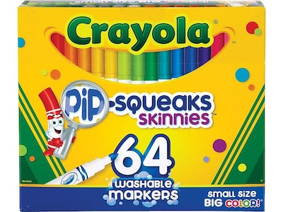 Make art assignments fun with these washable markers. The compact design makes it easy to store these markers or bring them on the go, while the washable formula lets you remove ink from clothing, desks, and other items. These Crayola Pip-Squeaks Skinnies markers come in a pack of 64, so you have plenty on hand to accommodate large classes or big projects.