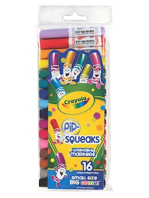 Pip-Squeaks may be small in size but they have BIG color! The small size of Crayola Pip-Squeaks Markers makes them easier for young children to hold and use. Their conical tips can draw thick or thin lines, and they have washable inks. Best of all, they have a re-usable pouch for easy storage.The set includes 16 fun colors: Leprechaun Green, Golden Nugget, Raspberry Squirt, Petite Rose, Tiny Plum, Teensy Teal, Rain Drop Blue, Copper Penny, Dinky Pink, Firefly Red, Toy Poodle Black, Mini Brown, Kitten Gray, Little Lemon, Sweet Violet and Little Boy Blue.