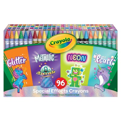 - Features 96 Crayons, with 24 each of Neon, Metallic, Pearlescent, and Glitter Crayons