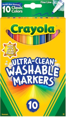 Fill in large spaces or create intricate designs with these fine markers. The non-toxic ink in these markers is easy to wash off skin and walls, while ColorMax formulation ensures that the colors are bold and bright where they are wanted. This box includes 10 Crayola ultra-clean fine-line markers in assorted colors to suit any art project.