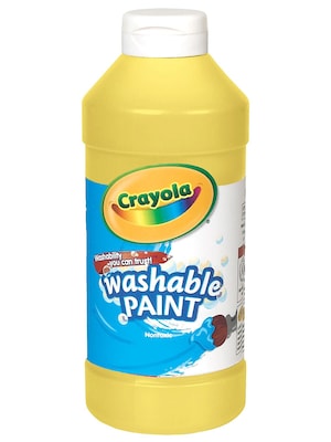 Twelve brilliant colors ready to use straight from the jar. Excellent adhesion. Great workability on a variety of surfaces. 1 pint, easy squeeze plastic bottle. Children can express themselves freely and brightly, while parents and educators can rest assured that cleanup will be a breeze. Paint cleans easily from skin and most children's clothing with just soap and water. It is also freeze-thaw stable, and the non-separating formula gives it an excellent shelf life.Crayola Washable Paint comes in 16 oz. (473 ml) bottles.