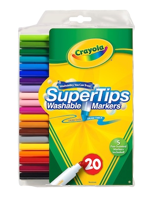 Crayola Super Tips Markers have unique, durable tips for drawing thick or thin lines. Use the sides for coloring in large areas and the tips for adding details. Super Tips are great for school projects, doodling, and coloring fun.These markers use ink that-s formulated to easily wash from skin and most children-s clothing. Crayola Washable Markers are the world-s most washable markers!As an added bonus, these sets include some Silly Scent markers. The set of 20 contains five markers with silly scents and the set of 50 contains twelve.
