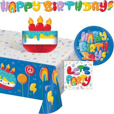 - The party supplies in this kit features colorful, playful balloon designs with "Happy Birthday" and "Let's Party" text, accented by doodles and confetti