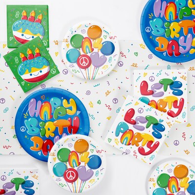 Each Bubbly Birthday Tableware Kit includes: eight Bubbly Birthday Dinner Plates (9"), eight Bubbly Birthday Dessert Plates (7"), 16 Bubbly Birthday Dinner Napkins (6.5"), 16 Bubbly Birthday Beverage Napkins (5"), and one Bubbly Birthday Paper Tablecloth (54" x 96"). Pump up the fun at your birthday bash with help from our Bubbly Birthday Tableware Kit. This 49-piece kit is ready to serve up to eight guests at your birthday celebration. The plates, napkins, and paper tablecloth in this kit feature colorful, playful balloon designs with "Happy Birthday" and "Let's Party" text, accented by doodles and confetti. Snag our Bubbly Birthday Tableware Kit and finish party planning with our other Bubbly Birthday party supplies and our Bermuda Blue and School Bus Yellow coordinating solids.