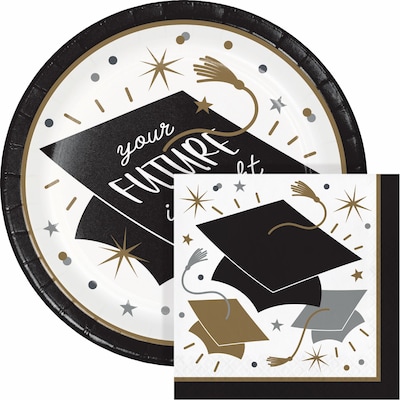 Each Glowing Grad Paper Plates and Napkins Kit includes: 16 Glowing Grad Dinner Plates (9") and 32 Glowing Grad Napkins (6.5"). Our Glowing Grad Plates and Napkins Kit is perfect for any Graduation brunch, luncheon, or dinner celebration. This kit includes premium quality paper plates and napkins, which will help make cleanup easy after your event. The party supplies feature a black, silver, and gold graduation cap and confetti design with "Your Future is Bright" text. This 48-piece kit serves up to 16 guests. Browse our entire Graduation collection for more ideas!