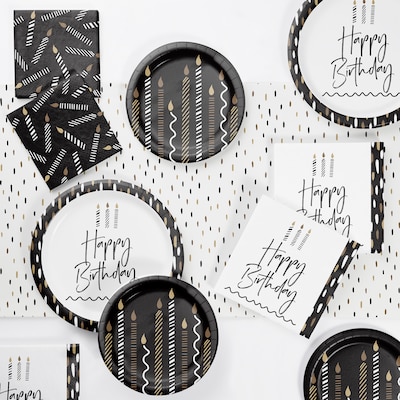 - The party supplies feature a gold, black, and white design with artistic birthday candles and "Happy Birthday" text