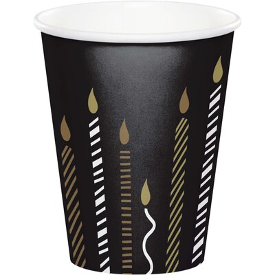 - The cups feature a pattern of birthday candles in a chic black, white, and metallic gold color palette