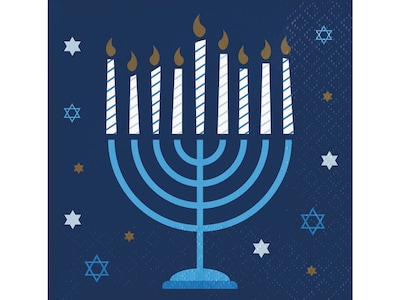 Add some shine to your Hanukkah table with this Creative Converting beverage napkin. This unique cocktail napkin features a light blue menorah with white candles and gold-tone metallic ink as the flame. The design also showcases Stars of David all around against a navy background to add a special festive touch to your celebration. Measuring 5", this napkin is perfect for setting the table or handling out with party beverages as everyone enjoys the party. Sold in packs of 48, be sure to grab enough for your upcoming Hanukkah dinner. Pair with any other Hanukkah party supplies to make your party special.