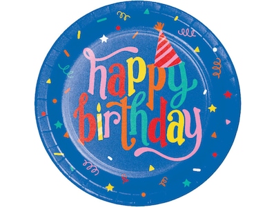 Make a festive statement with this Creative Converting Hats Off dinner plate at your next birthday celebration. Featuring a cobalt blue background with Happy Birthday message in the middle and a party hat, candle, and confetti all around, this plate is sure to impress guests. This dinner plate easily serves your favorite shareable dishes including chips and dip, pizza, slider hamburgers, hotdogs, brownies, and cake. Made of recyclable paper for your convenience, so you can focus on the fun instead of the cleanup. Sold in packs of 24, this dinner plate can be paired with other Hats Off birthday party supplies to bring a unique party theme to life.
