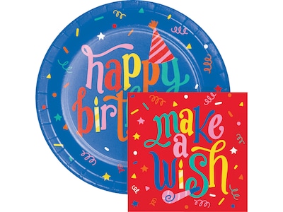 - Features a birthday theme with hats, colorful confetti, and noisemakers; the plates come in blue with Happy Birthday writing, the napkins come in red with Make a Wish writing