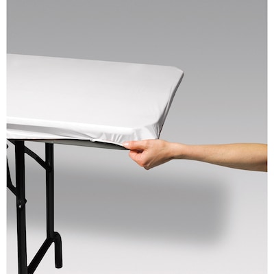 This White Stay Put Table Cover will provide an eye-catching setting at your upcoming event. This plastic table decoration measures 29" x 72” and features elastic around it's edges to keep it held firmly in place. The crisp tablecloth will keep permanent stains away and is ideal for children's' birthday parties, banquets, receptions, or any celebration. Sold in packs of 3.