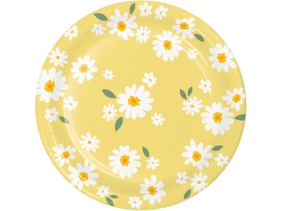 Dish out dinner in style with this Creative Converting Sweet Daisy dinner plate. Featuring a bright yellow background with white daisies scattered all over, this trendy plate is sure to delight guests. Perfect for baby showers and birthday parties, this plate adds a pop of color to any party table. Measuring 9"Dia., this paper plate is a great way to serve party meals, sweet treats, shareable appetizers, and more. Dish up pizza, slider hamburgers, hotdogs, brownies, cake, and more to guests. Made of recyclable paper for your convenience, so you can focus on the fun instead of the cleanup. Sold in packs of 24, this plats can be paired with other Sweet Daisy party supplies to bring a unique party theme to life.