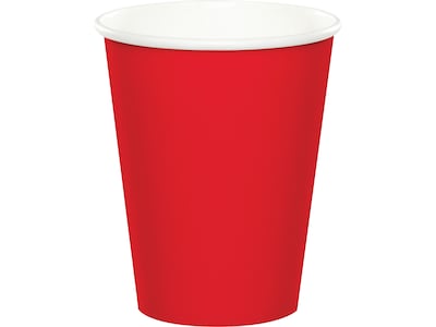 Able to handle both hot and cold beverages, the Creative Converting classic red cup is a budget-friendly way to add a little style to the table display. The paper cup holds 9 oz. and is perfect for festive party punches, as well as coffee and tea service at big get-togethers or family meals. The sturdy cup is sold in a pack of 72 and coordinates perfectly with other tableware selections from the complete line of Touch of Color party supplies.