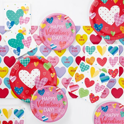 Each Vivacious Valentine Tableware Kit includes: eight Vivacious Valentine Dinner Plates (9"), eight Vivacious Valentine Dessert Plates (7"), 16 Vivacious Valentine Napkins (6.5"), and one Vivacious Valentine Plastic Tablecloth (54" x 102"). Set your Valentine's Day table in style with help from our Vivacious Valentine Tableware Kit. This kit includes everything you need to set your Valentine's Day table, including plates, napkins, and a plastic tablecloth. The party supplies feature a design of colorfully patterned hearts, ready to set the scene at your V-Day bash. This 49-piece kit serves up to eight guests. Complete your celebration with our coordinating Valentine's Day decor and more!