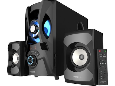 The Creative SBS E2000 all-round 2.1 speaker system is set to captivate you with its incredible audio performance while offering wired and wireless connectivity options. With the SBS E2900, stream wirelessly via Bluetooth, listen to your favorite FM radio channels, or play your audio of choice directly via USB or SD card playback. For wired connectivity, connect your device to the 3.5mm AUX-in input. To top it all off, you may also easily access and change volume and playback control settings directly on the speakers, or customize the treble and bass settings with the included wireless infra remote control. The Creative SBS E2900 is designed to fulfill your need for an uncompromised, high-performance audio entertainment system.