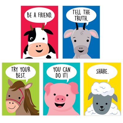 The motivational messages and playful designs on the posters in this Farm Friends Inspire U Poster 5-Pack will brighten any space. Great for display in a school, preschool, daycare, or anywhere a little inspiration is needed. Pack includes 5 motivational posters: 10245 Be a friend. (cow), 10246 Tell the truth. (goat), 10247 Try your best. (horse), 10248 You can do it! (pig), 10249 Share. (sheep). Each poster measures 13" x 19".