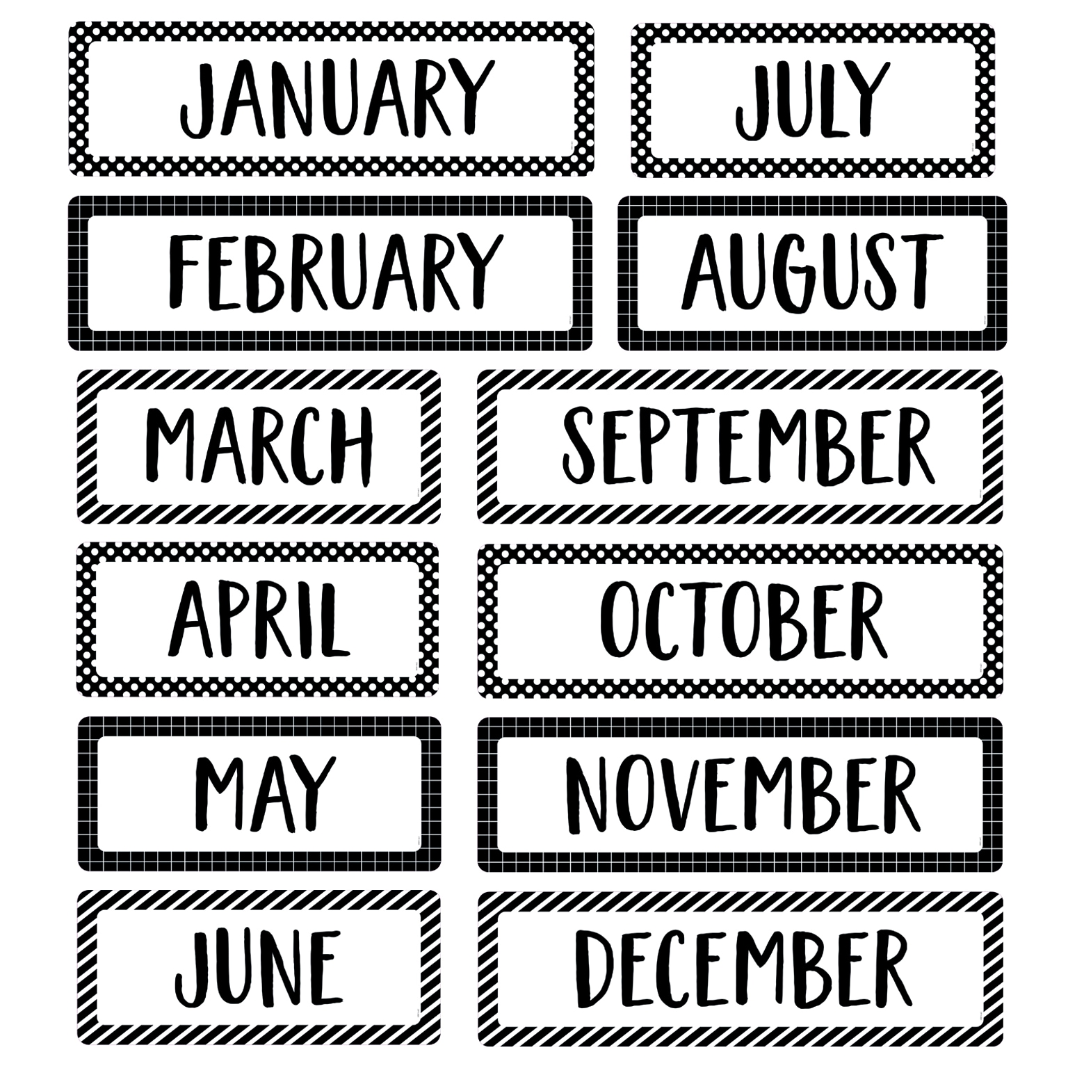 Featuring a classic style, these Core Decor Months of the Year headlines are great for use with a calendar chart during a daily calendar lesson or circle time. Included in the set are 12 month headlines and 6 bonus square cut-out accents. Sizes range from approximately 15" to 20" w x 5" h.