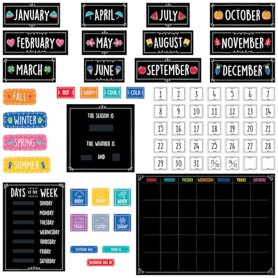 This Doodle Calendar Set is designed to look great with any bulletin board décor scheme. Use the moveable pieces to teach calendar concepts, display the month of the year, the days of the week, and record the changing seasons and daily weather conditions. This 67-piece classroom calendar set includes a calendar chart, 12 month headlines, 33 pre-numbered calendar days, and 2 blank calendar days. The set also includes a days-of-the-week chart, a seasons and weather chart, and coordinating labels. The pops of color and white text on black background make this set perfect for children at home or at daycare, preschool, or elementary school. This Bulletin board set also includes an instructional guide with display ideas, classroom activities, and a reproducible.