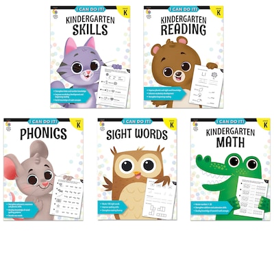This skills practice 5-book set helps children develop letter and number knowledge, build phonemic awareness skills, and strengthen knowledge of basic math concepts. Every child can "do it" with CTPs workbook series. The activities in the I Can Do It! series provide repeated practice to aid mastery with essential skills and academic concepts. Use these books to introduce, reinforce, or extend learning. Perfect for home, school, or on the go, the I Can Do It! workbooks provide smart skill practice that makes learning fun and leads to academic success! Each book measures 7" x 9" and includes 56 pages. I Can Do It! workbooks include: practice of essential skills, skills list and parent tips, incentive chart to track progress and answer key. This 5-Book Pack contains the following titles: Kindergarten Skills, Kindergarten Reading, Phonics, Sight Words, and Kindergarten Math.