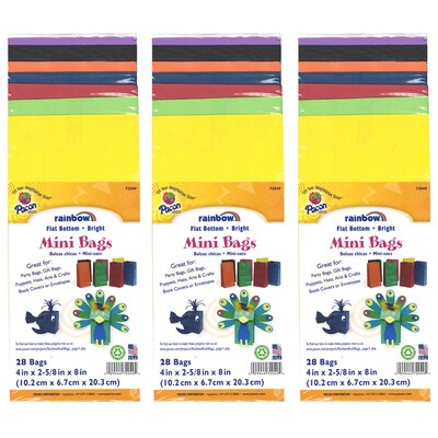 Perfect for many arts and crafts projects like making puppets, masks, party bags, hats and gift bags. Our bags are made from high quality, brightly colored uncoated kraft paper that accepts all types of media like crayons, pens, paints and rubber stamps. Recyclable. Measures 4" x 2-5/8" x 11". Each pack includes 28 bags in assorted bright colors. Sold as 3 packs for a total of 84 bags.