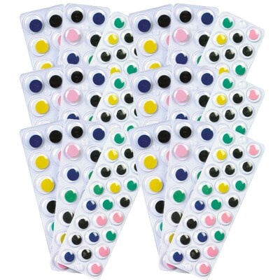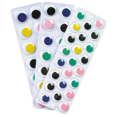 Wiggle Eyes bring projects to life! These convenient Peel and Stick Wiggle Eyes are easy to adhere to different surfaces. Ideal for the classroom, art room, daycare, or home. Each pack includes 60 eyes in three sizes: 23 pieces of 15 mm, 20 pieces of 18 mm, and 17 pieces of 20 mm eyes. Sold as 6 packs for a total of 360 pieces.