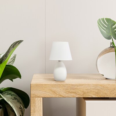 A petite table lamp made primarily of ceramic with its oblong base shape sits beneath a matching colored tapered fabric shade for an overall effortlessly styled lamp suited for both your décor and lighting needs. A number of color options are available in this style, to compliment your decor just right.