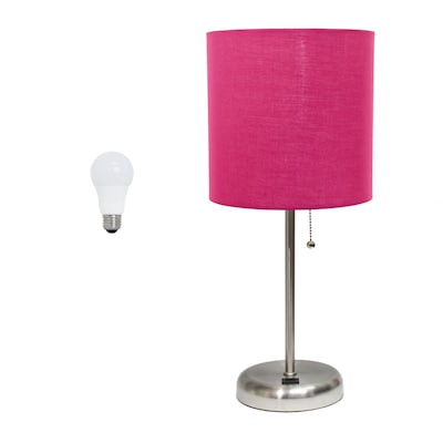 Creekwood Home Oslo 19.5" Contemporary Bedside USB Port Feature Standard Metal Table Desk Lamp in Brushed Steel with Pink Drum Fabric Shade for Home Décor, Bedroom, End Table, Living Room, Dorm, Office, With Feit LED Bulb