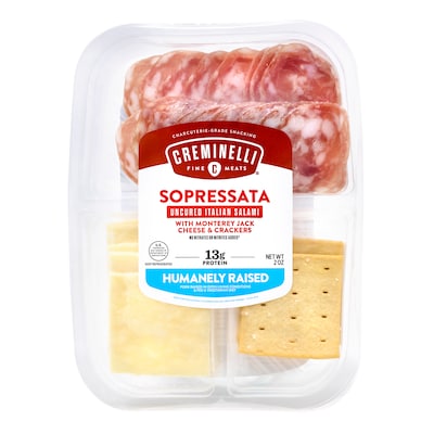 Uncured Italian salami made with Sangiovese red wine and organic garlic paired with Monterey Jack cheese and sea salt & olive oil crackers.