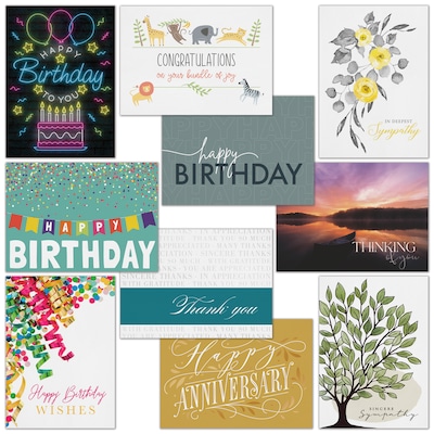 - The assortment pack includes 10 each of 4 birthday card designs, 10 each of 3 sympathy card designs, 10 each of an aniversary, thank you and congratulation design for a total of 100 cards and fastick envelopes