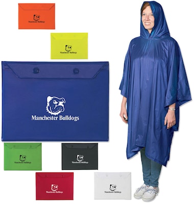 - One-size-fits-all ponchos are constructed from 4 mil PVC vinyl Includes drawstrings on hood; Plastic snap pouch