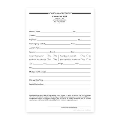Custom Carbonless Veterinarian Boarding Agreement, 5-1/2" x 8-1/2", 100 Sets per Pad