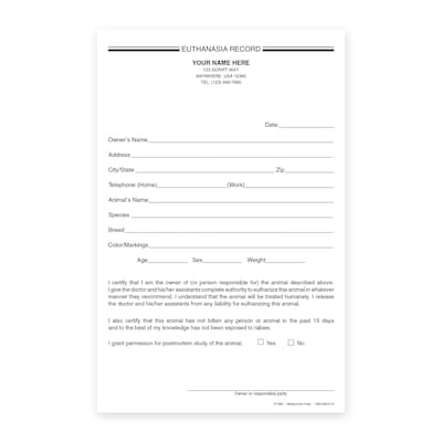 Custom Carbonless Veterinarian Euthanasia Record, 5-1/2" x 8-1/2", 100 Sets per Pad