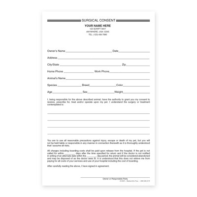 Custom Carbonless Veterinarian Surgical Consent Form, 5-1/2" x 8-1/2", 100 Sets per Pad